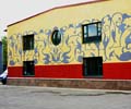 На этот раз для отделки фасада была выбрана технология росписи по штукатурке. Яркие желтые и красные фоновые цвета